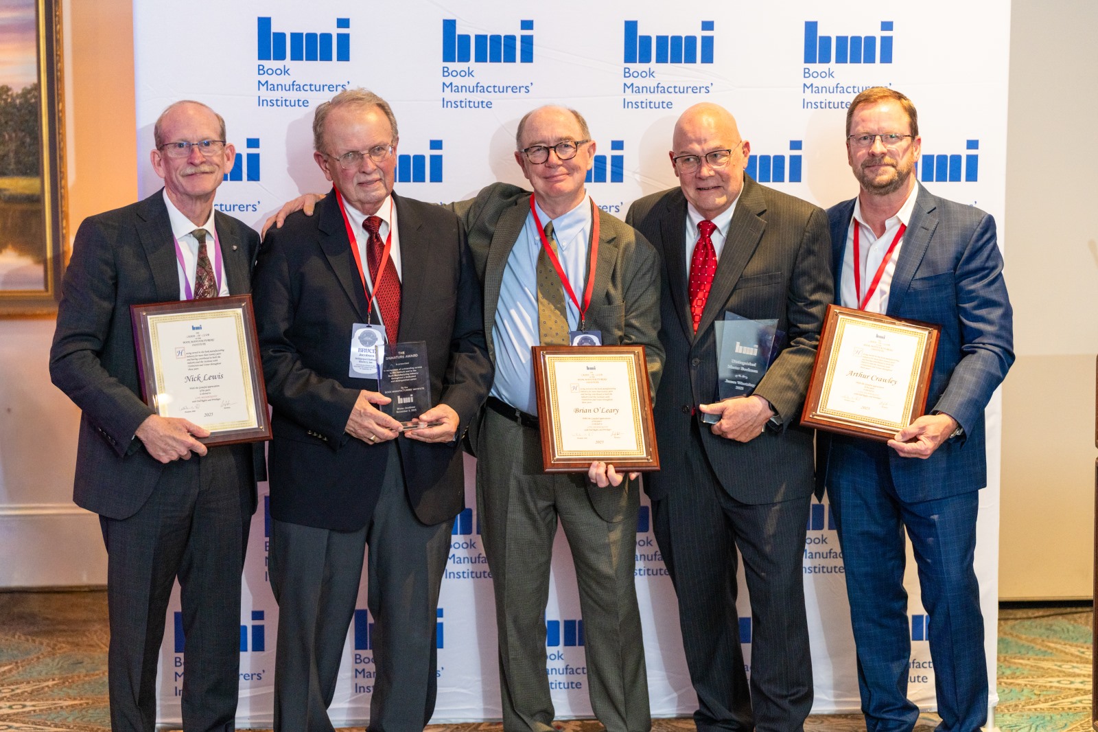 Membership in the Cased-in Club is awarded each year to BMI members who have served in the industry for more than 20 years and have worked with the BMI with distinction. The 2025 recipients of this privilege are: Art Crawley of Kolbus; Nick Lewis of Publisher’s Graphics; Brian O’Leary of BISG.
